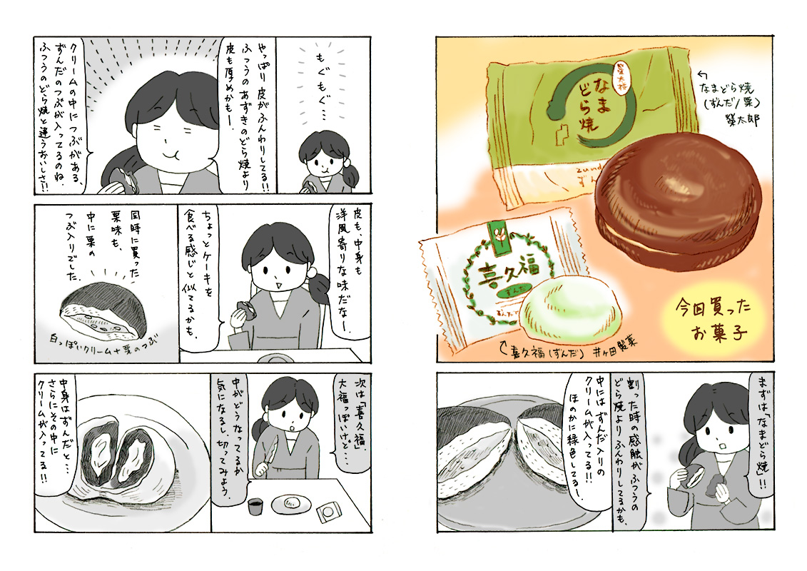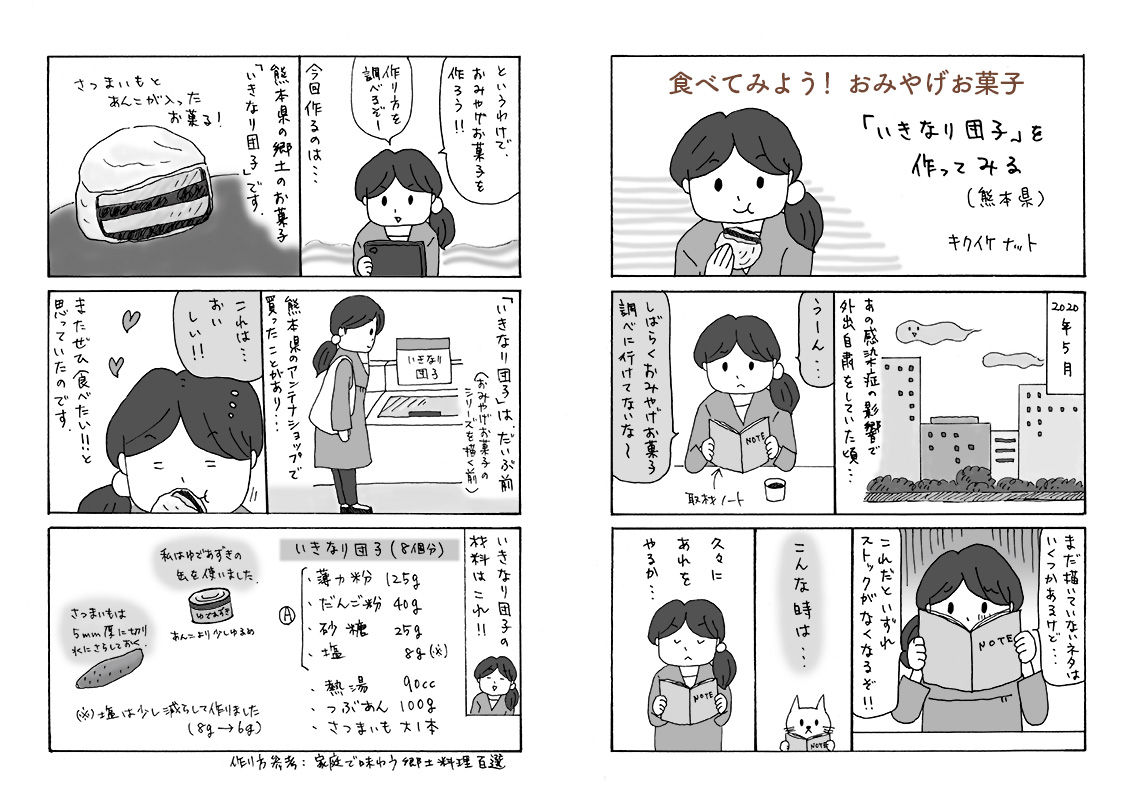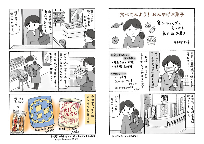 近年は全国のおみやげお菓子・郷土のお菓子を調べた「食べてみよう!おみやげお菓子」シリーズを描くことが多いです。